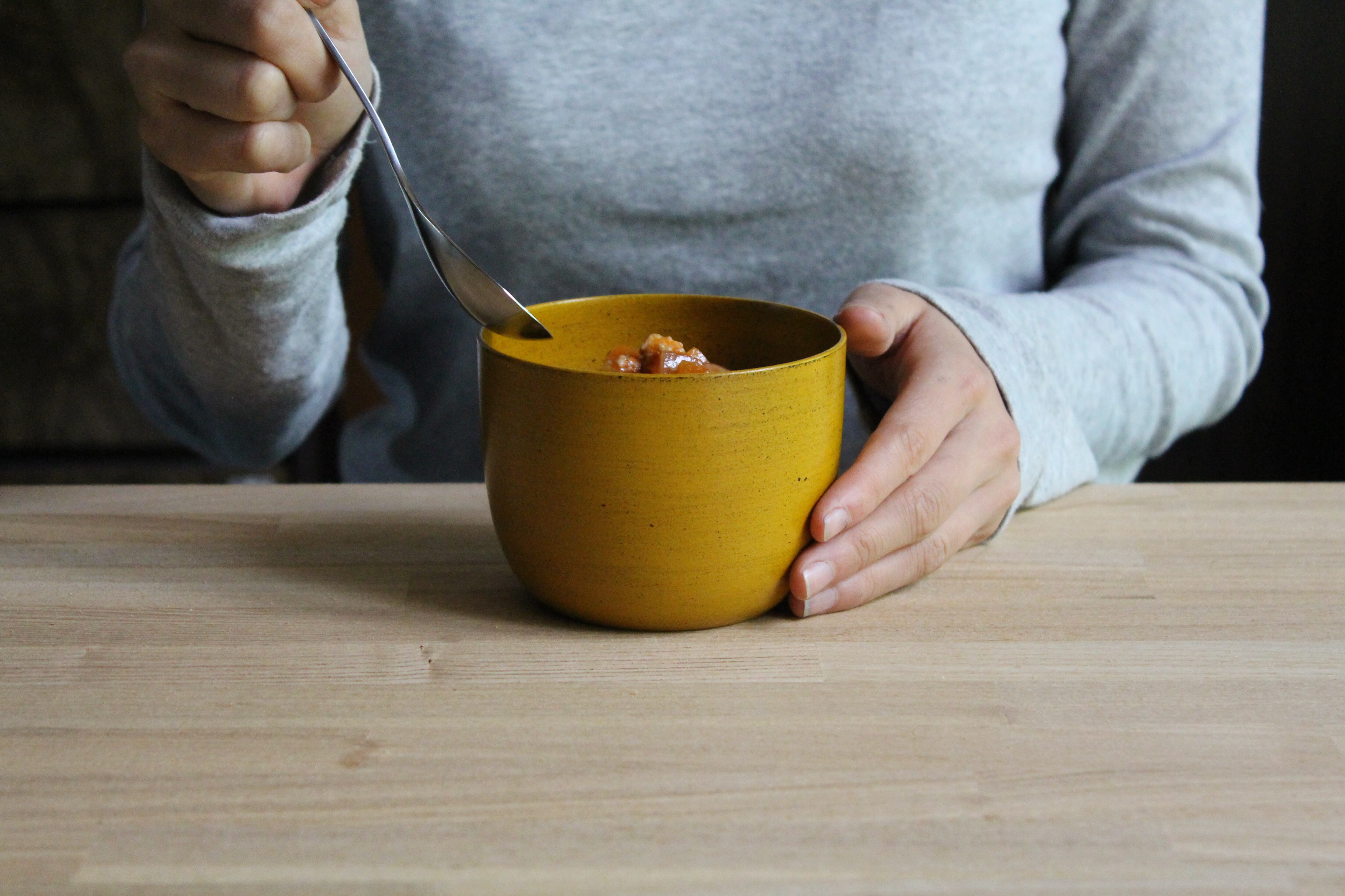 陶器のような見た目ですが、国産の木のかたまりからくり抜いて作っているため、お子様からご年配のかたまで使いやすい軽さです。